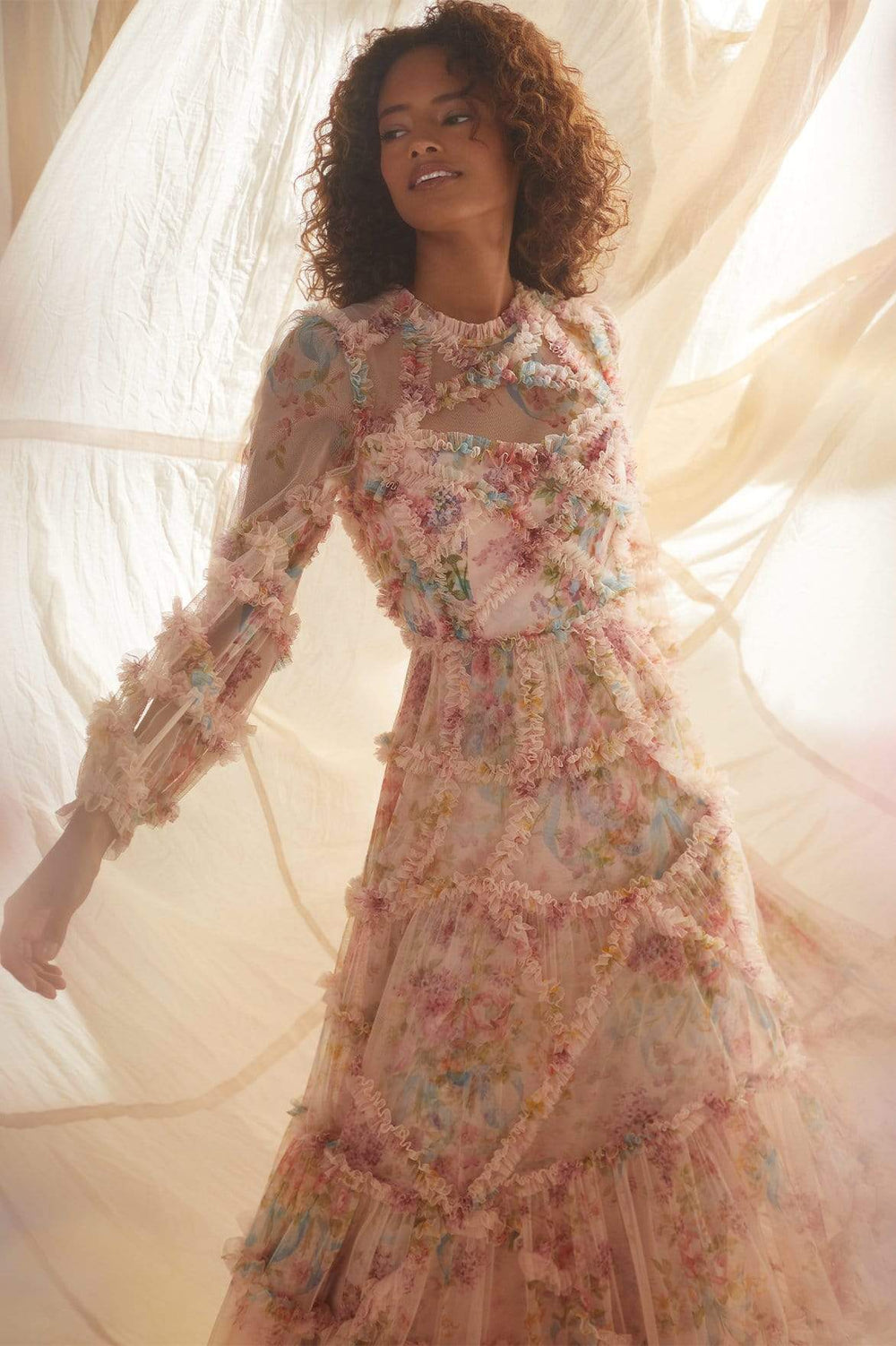 NEW SEASON. Floral Diamond Ruffle Gown in Topaz Pink. This eye catching piece is crafted from delicate ruffled tulle with an all over vintage print taken from an early 1900's hand painted fabric design. A romantic look featuring voluminous cuffed sleeves and a flattering skirt that skims the body to gently increase in fullness, creating stunning movement within the tulle. This Victorian inspired look with a contemporary edge will be the star of your wardrobe.