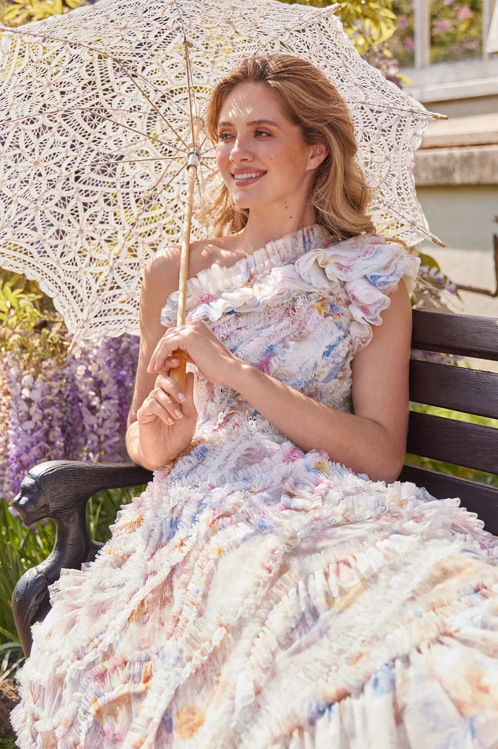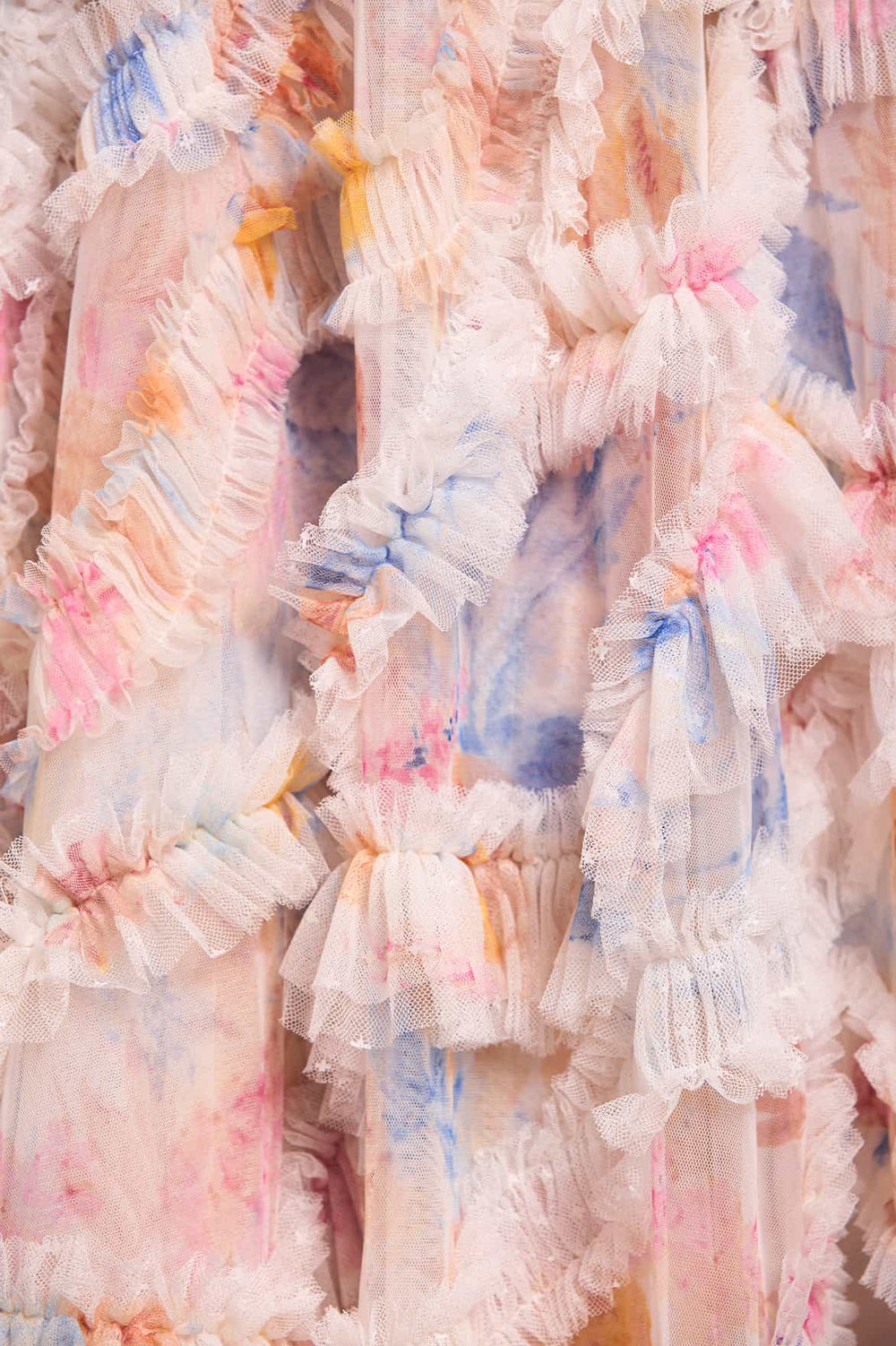 - Floral printed tulle decorated with floral printed tulle frills.