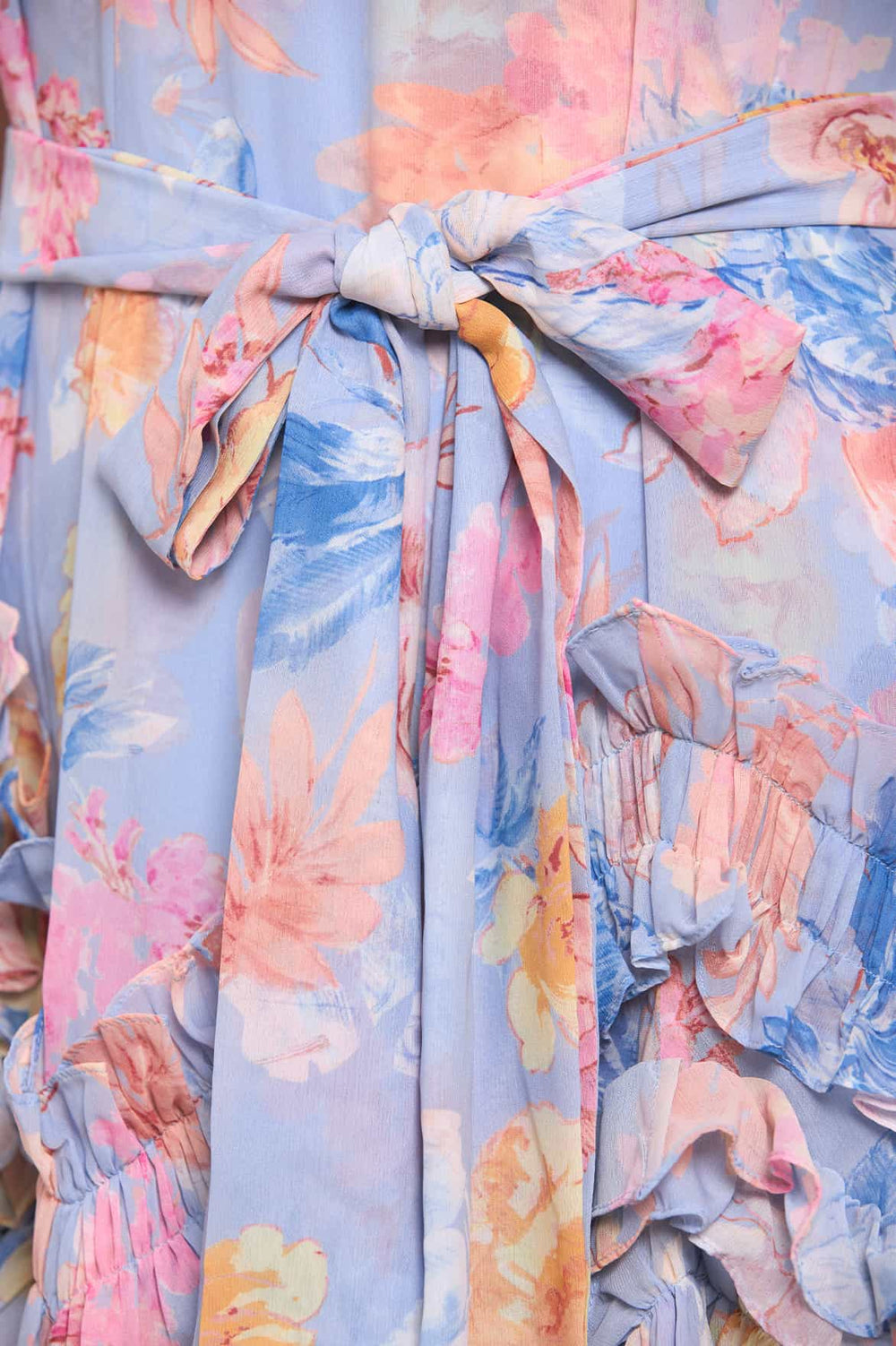 The Mariannes Floral Chiffon Sleeveless Micro Mini Dress in Sky Blue, inspired by Victorian botanist Marianne North. This dress features a vibrant floral print with bold brushstrokes. This dress has a halter neckline and a voluminous trapeze silhouette. Beautifully decorated with chevron frills on the skirt, while a gathered hem tier adds volume. A slim chiffon tie belt adds versatility, perfect for various styling options.