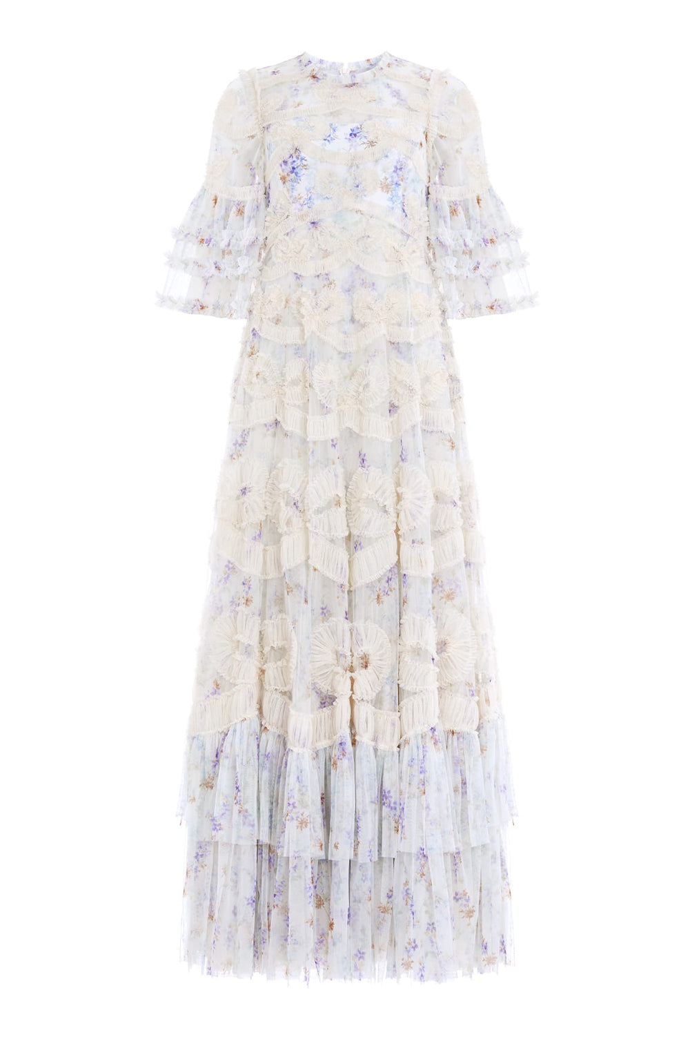 The Ophelia Ditsy Ingrid Gown in Moonshine/Blue. This beautiful, romantic trailing print was taken from an archive, and hand-painted artwork from the early 1900¡¯s depicting soft whimsical ditsy, floating florals. This iconic Needle & Thread style is beautifully engineered with delicate tulle and subtle texture to capture this ribbon motif. A gown you'll forever treasure.