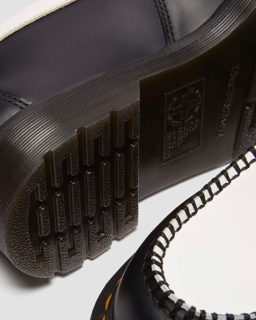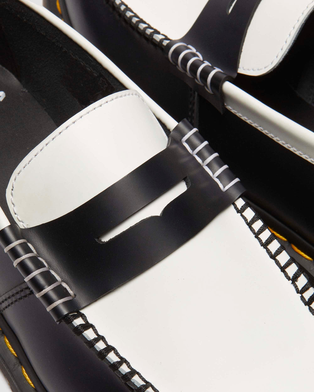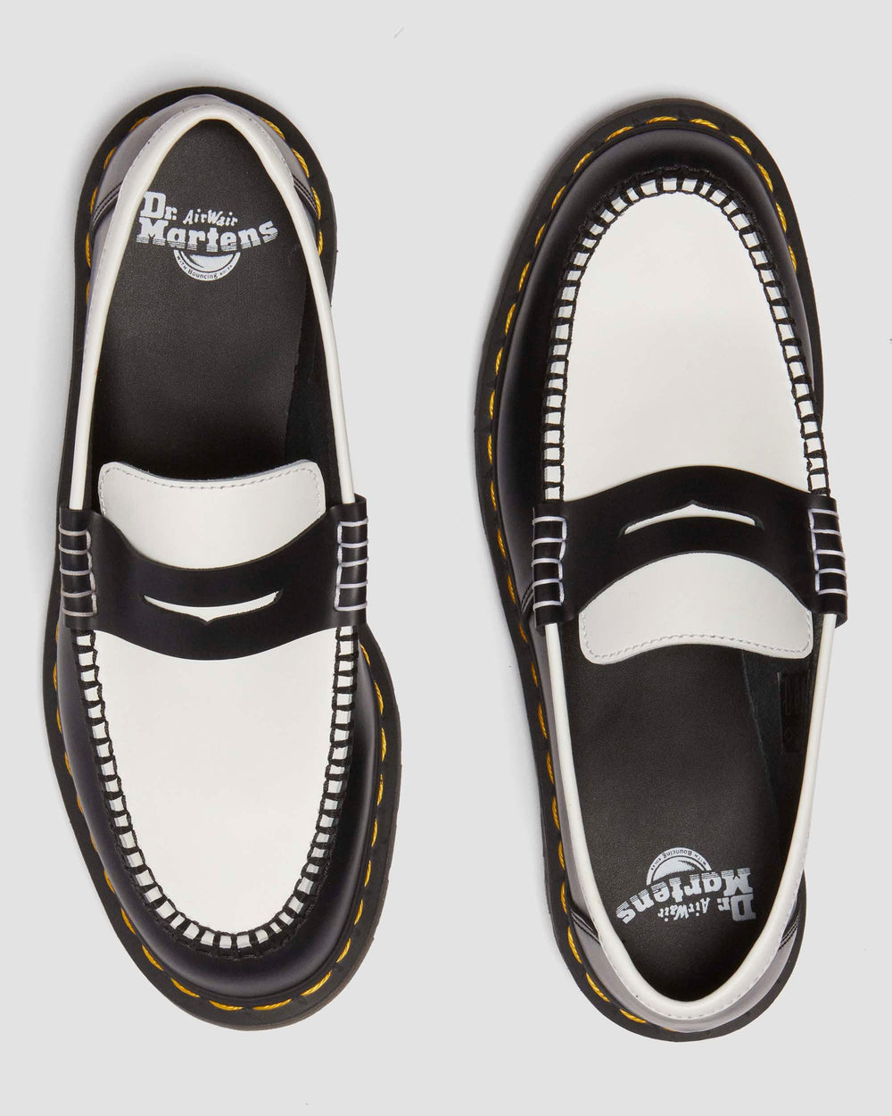 Keep it classic. The Penton loafer is a tassel-free, wider-fitting alternative to our Adrian loafer. It features subtle detailing across the upper, including a saddle strap and moc-toe stitching. The loafer is made from black Smooth leather with contrasting white Smooth leather across the vamp and around the top of the ankle. Our bouncing sole retains its signature grooved edge but is reworked in black with matching welt stitching.