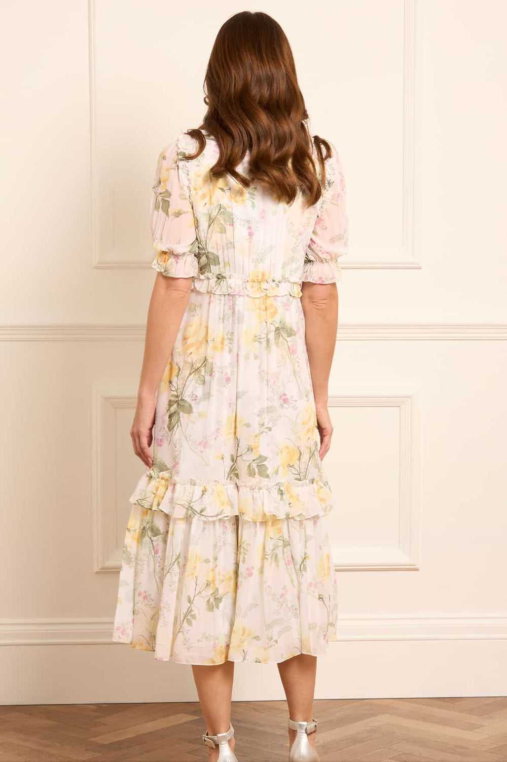 The Rose Chiffon Short Sleeve Ballerina Dress in Moonshine/Yellow features a romantic print inspired by antique hand-painted artwork, with large rose blooms and trailing florals. Made from soft chiffon, the loose-fitting silhouette offers a floaty, ethereal look. Designed with puff sleeves with gathered frill cuffs, a ruffled skirt tier, and chiffon ruffles at the neckline and under-bust seam complete the enchanting design The perfect dress to pack for your holiday.