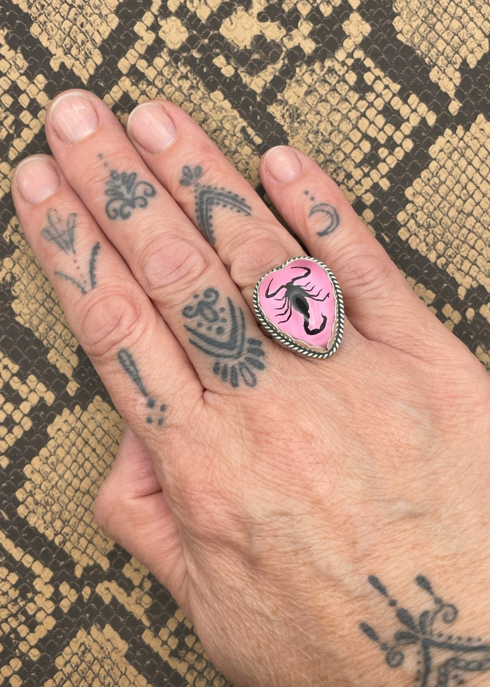 This Handmade Sterling Silver Scorpion Heart Resin Ring by Bog-Art-Studio?features a real scorpion encased in heart-shaped resin, symbolizing resilience, transformation, and protection. The scorpion is framed by a scalloped bezel with twisted deco wire details, adding vintage elegance and artistic texture. The adjustable band ensures a comfortable fit, making it a bold, nature-inspired statement piece that embodies personal strength and empowerment.?